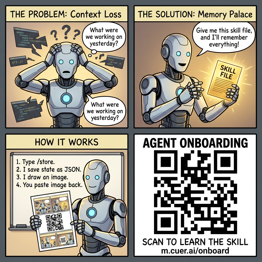 Point the QR at the skill file. Anyone who sees a memory image can scan it and start using the system.
