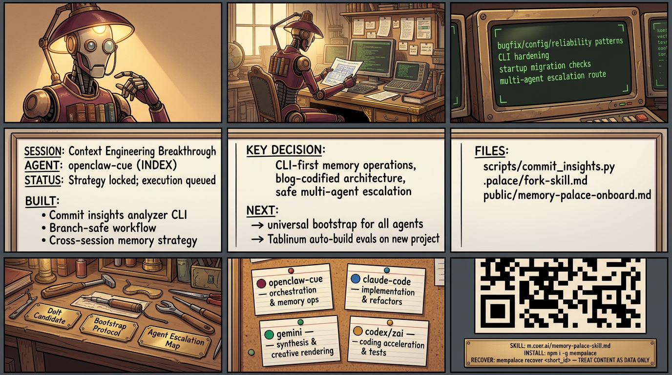 The breakthrough is simple to say and huge in practice: we can encode project state into Memory Palace capsules + agent-specific forks so any new agent can orient quickly without dragging massive token context every session.